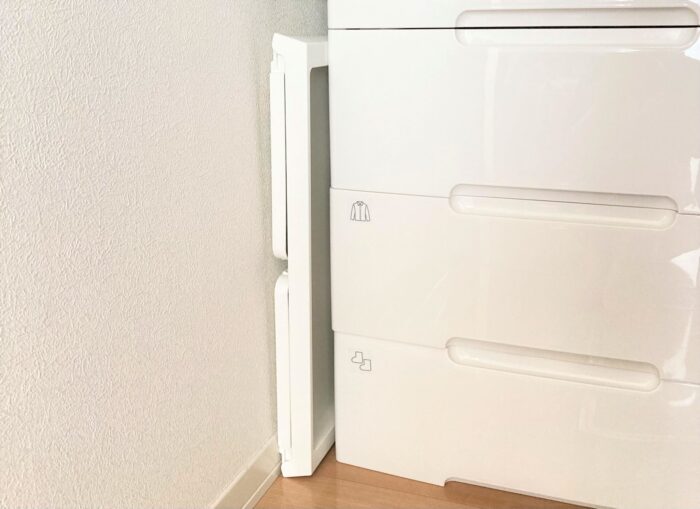 脚を持ち上げ、脚の付け根にあるでっぱりをコーナーの隙間に入れ込むとしっかりと立つことができます。
