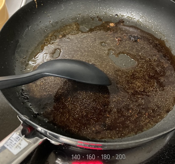 私は和風ハンバーグが好きなので、フライパンに残った肉汁と焦げにポン酢とみりんとごま油を合わせて和風ソースを作ります。