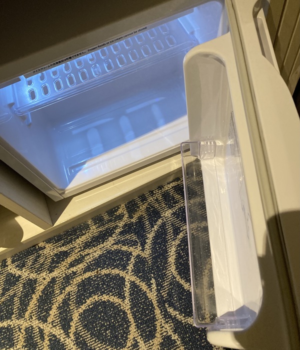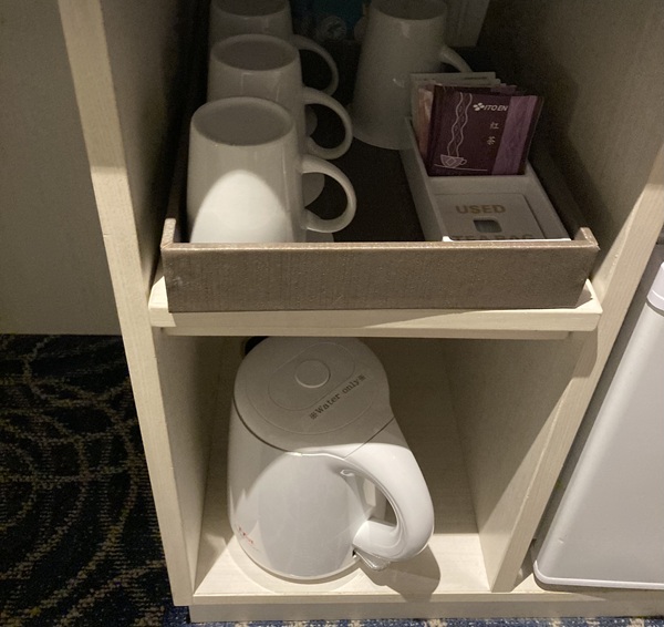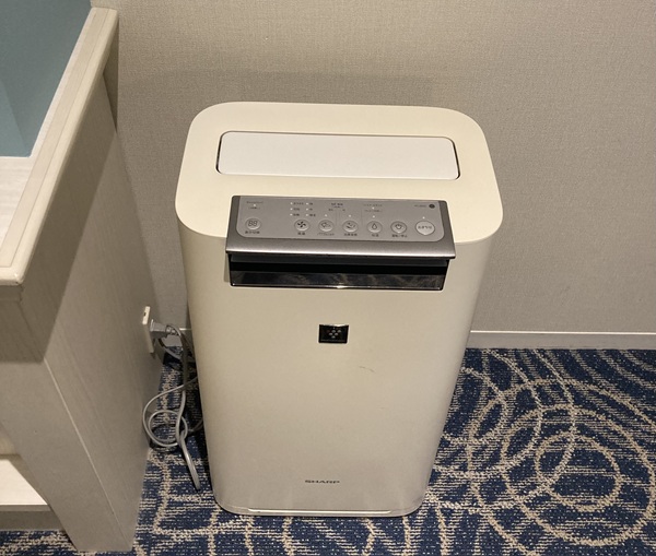 お部屋の設備としては、椅子2脚、テーブル、化粧台、加湿空気清浄機、冷蔵庫、金庫が常備。