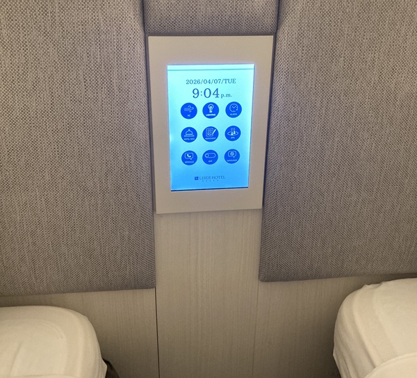 ベッドの枕元には、照明や空調などアラームがタッチパネルで操作できる仕様になっていました。