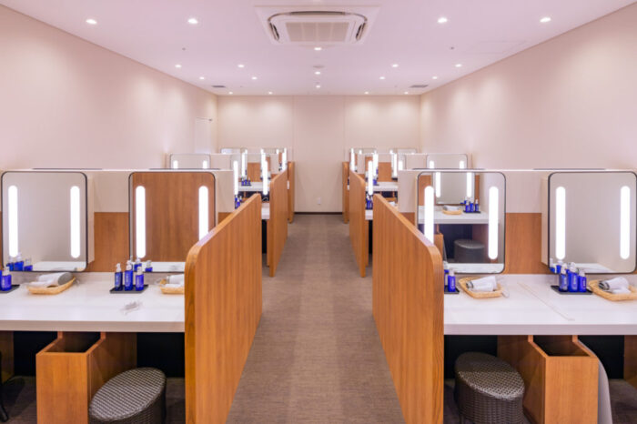 脱衣所の隣に、独立した化粧台があり、1つ1つの席にドライヤー・くし・化粧水・乳液【雪肌精】が置いてあり、ひと目を気にせずゆっくりとドライヤーで髪を乾かすことができました。